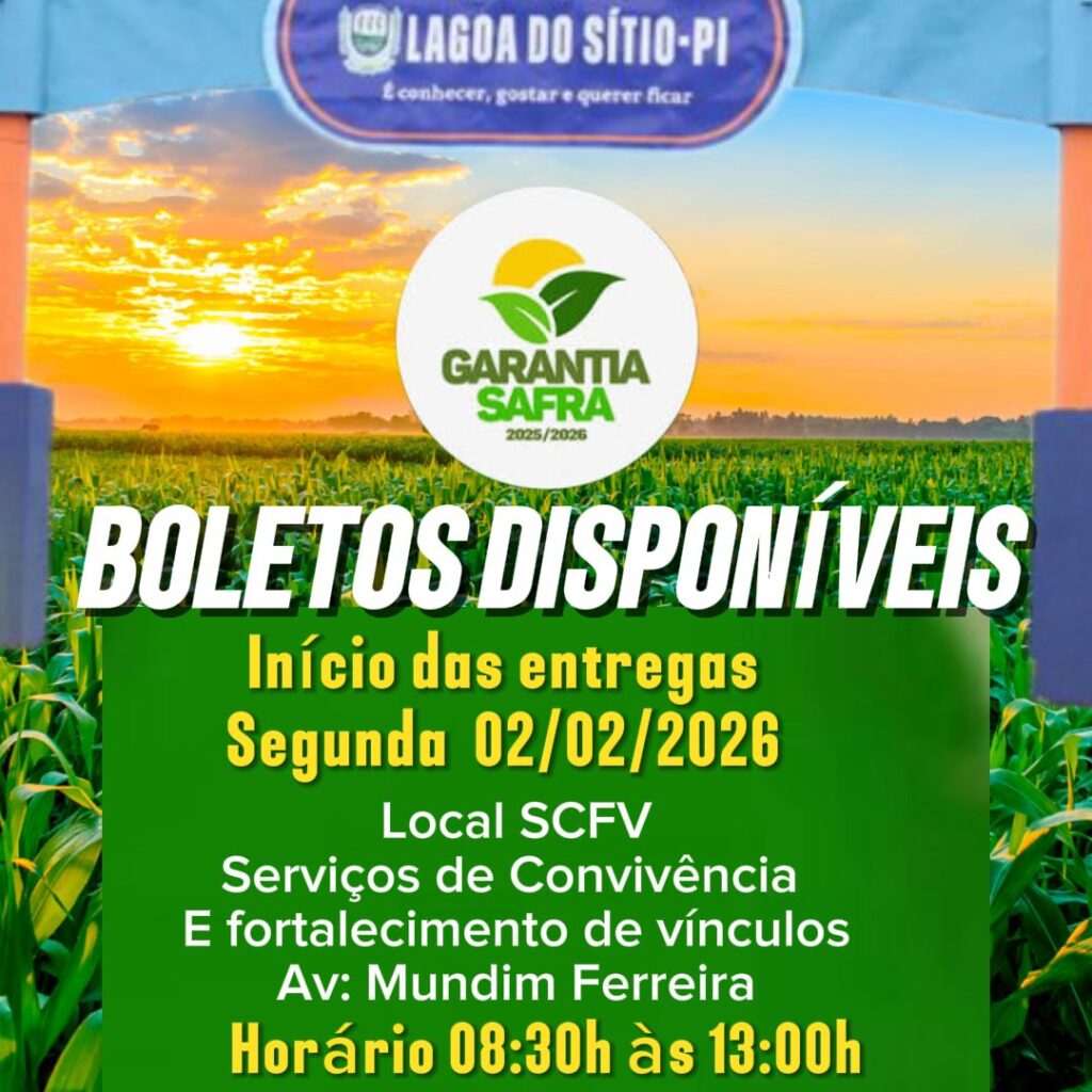 A Prefeitura de Lagoa do Sítio, por meio da Secretaria de Agricultura, informa que a partir da próxima segunda-feira (02/02/2026) será iniciada a entrega dos boletos para pagamento do Garantia Safra 2025/2026 para os beneficiários classificados no programa.